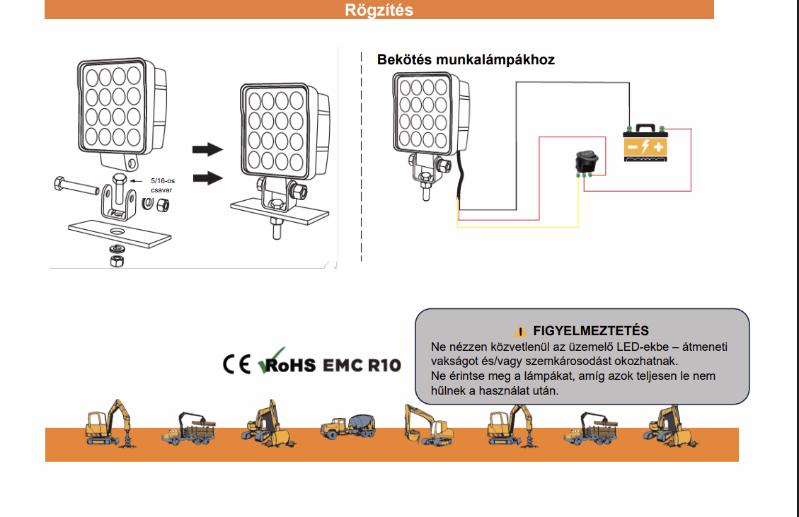 A beszerelés előtt ellenőrizze a jármű feszültségét, amelynek 10–40 V tartományon belül kell lennie. A lámpát mindig kikapcsolt áramellátás mellett csatlakoztassa. Rögzítéskor használja a mellékelt konzolt, és állítsa be a megfelelő megvilágítási szöget. Működés közben ne nézzen közvetlenül a LED-ekbe. Használat után hagyja a lámpát lehűlni.