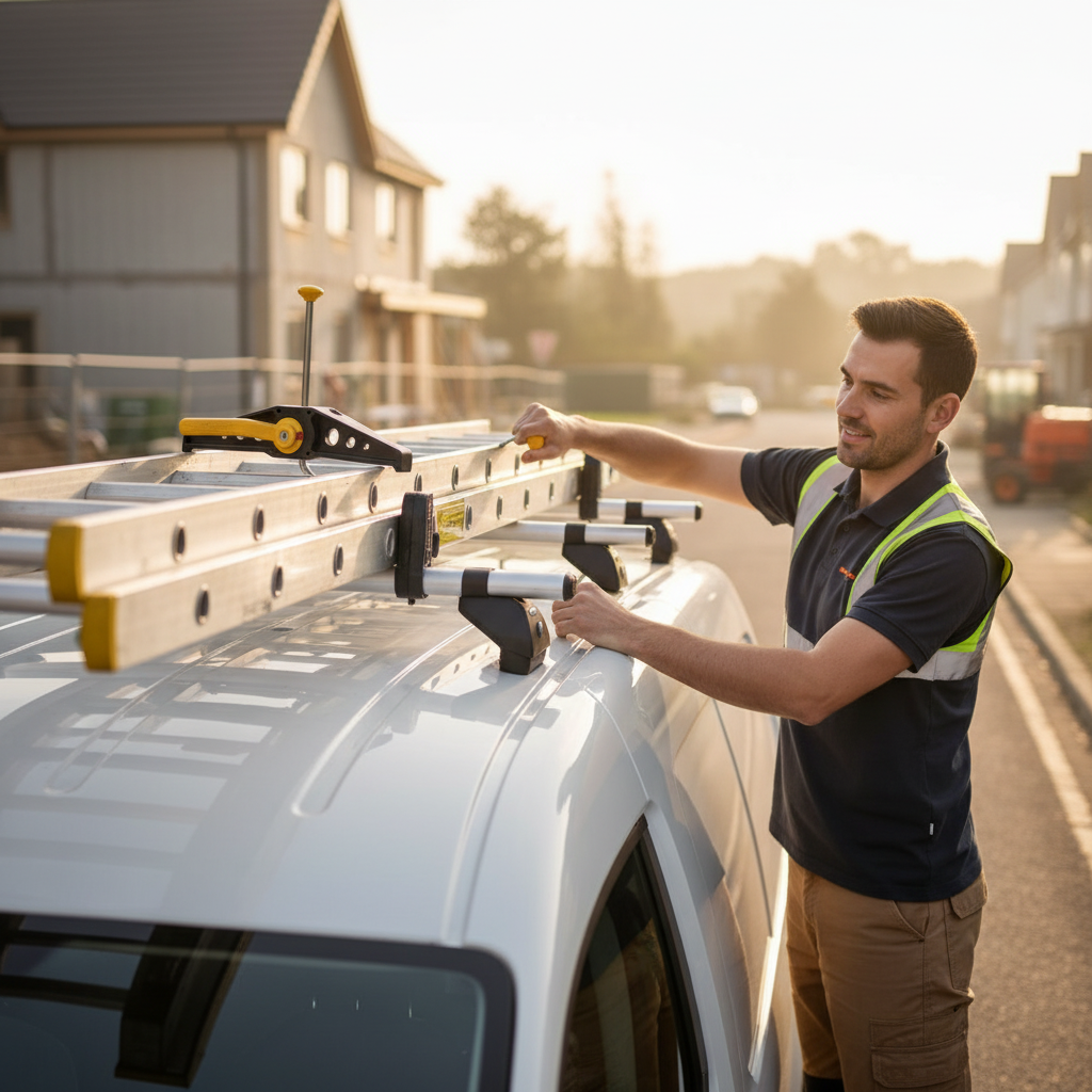 1. Előkészítés: Helyezd a létrát a tetőcsomagtartóra úgy, hogy stabilan feküdjön fel. Fontos, hogy a létra ne billegjen, és párhuzamosan helyezkedjen el a járművel.