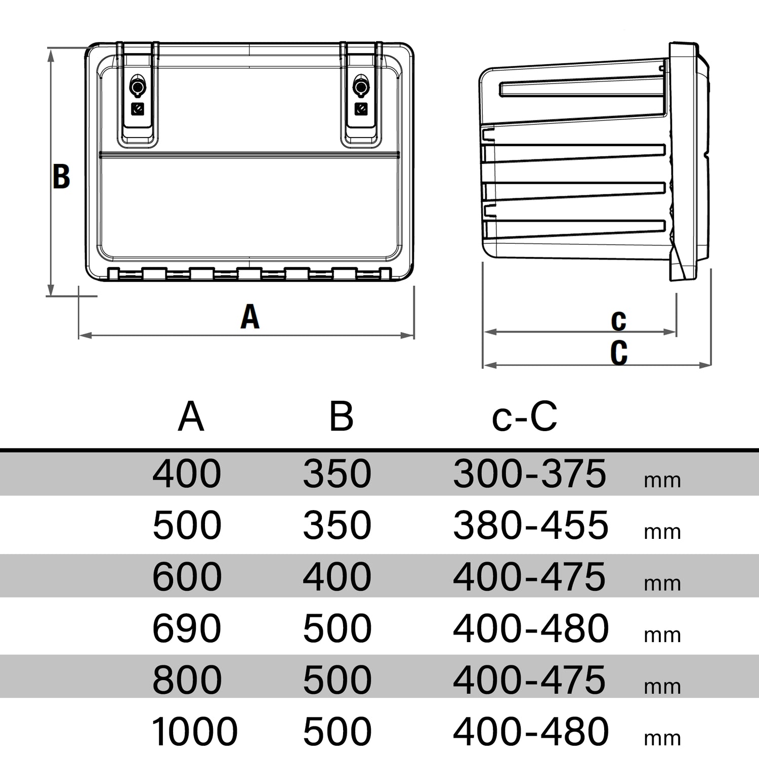 Ezek a szerszámos ládák több méretben elérhetők, amelyek mindegyike kiválóan illeszkedik a különböző járművek igényeihez. Az ECE 73R01 felfogatással szabvány szerint oldalsó aláfutásgátlóként is használható, így nemcsak praktikusak, hanem a biztonsági előírásoknak is megfelelnek.